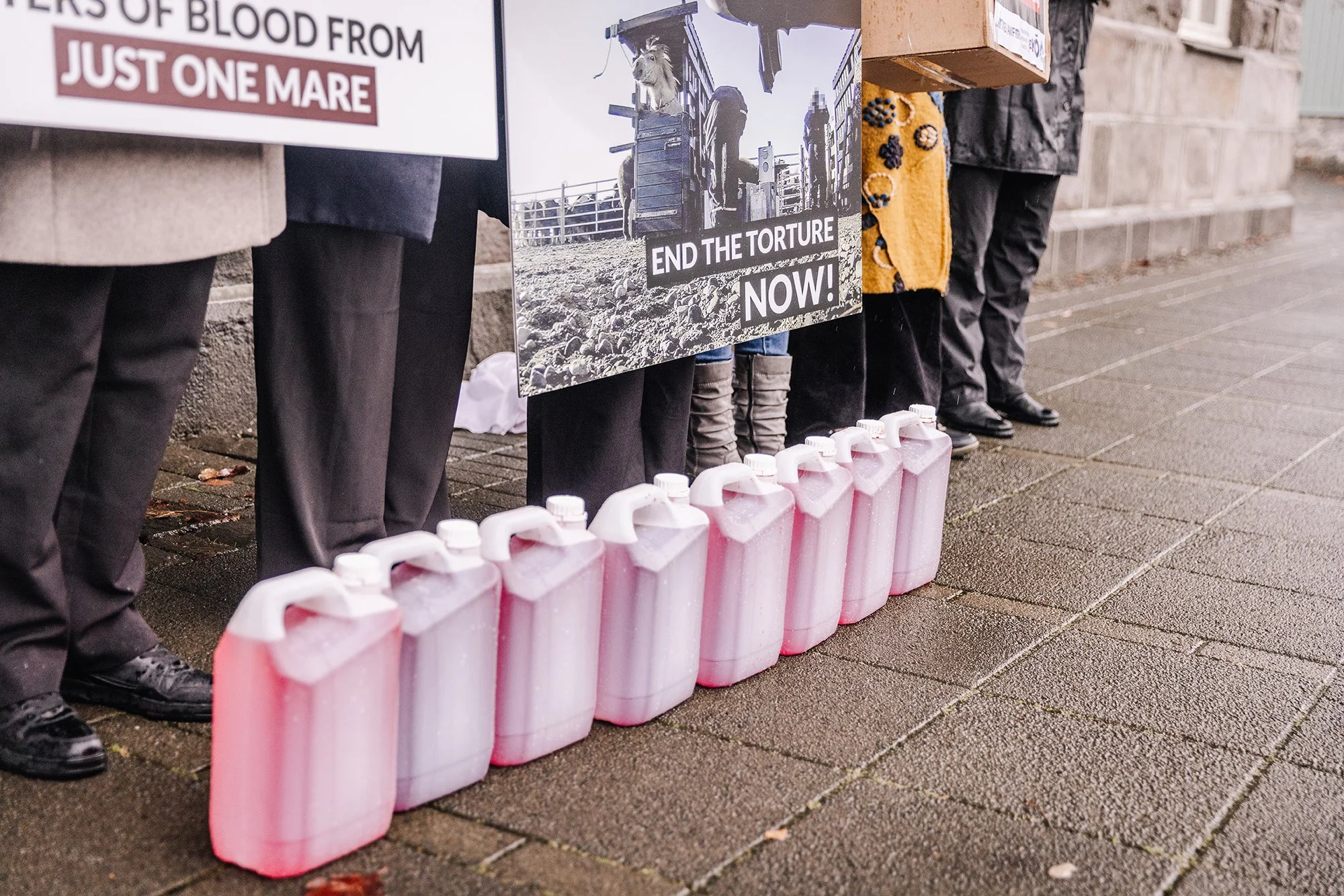 Samtökin stóðu fyrir táknrænni aðgerð fyrir framan Alþingi, þar sem sýnt var hversu mikið blóð er tekið úr hryssum í blóðmerahaldinu árlega, eða 5 lítrar á viku í allt að 8 vikur í röð.